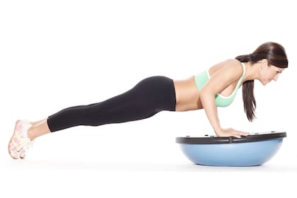 - Push Up. se usa la Bosu Ball desde su parte plana, tomando la media esfera con ambas manos con el cuerpo estirado, se mantiene la posición flexionando brazos, llevando el cuerpo lo más cerca posible de la base.