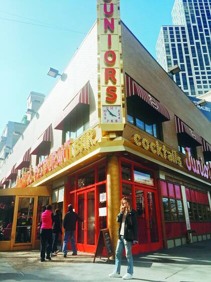 Visitar Junior's también es una experiencia cálida y siempre se come bien por un buen precio. Se trata de un tradicional dinner estadounidense que nació en 1950 con ninguna otra pretensión más que servir platos ricos, suculentos y muy locales. La circulación de gente es constante y los domingos se vuelve más familiar, de muchos grupos recién salidos de la iglesia, señoras afro con guantes, sombreros enormes y atuendos extravagantes, colores vivos y risas infinitas. La variedad de cheesecakes es extensa y hay ediciones especiales según la fecha. Una es más tentadora que la otra, pero yo me quedo con la más sencilla, sin coberturas ni rellenos. La cheesecake que en Junior's llaman "original".