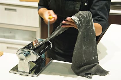 No, la tinta de calamar le otorga humedad, entonces compenso con menos huevo. Para trabajar la masa lo más importante es tener sensibilidad. Tiene que ser dura, hay que amasar bastante, tiene que costar... quedar casi no integrada. Hay una receta clásica que dice que cada 100 gramos de harina ponés un huevo. Yo voy sintiendo la masa y viendo qué le hace falta. También uso un poquito de semolín mezclado con la harina común para que quede bien dura. Si la pasta te queda medio blandita después, cuando la sobás, al agregarle más harina se pierde el sabor. Hay que tener cuidado.