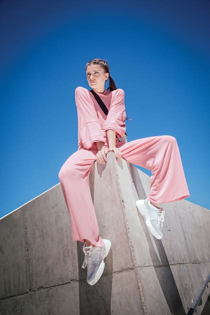 Buzo y pantalón oversize (Vitamina), zapatillas deportivas (Prüne), cartera plata (Prüne)