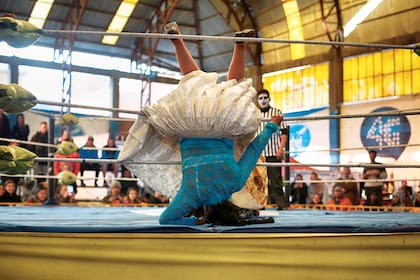No sé qué dice la tradición respecto de la construcción de gimnasios. Con suerte, no estemos parados sobre el cuerpo de nadie. A un lado del ring hay unas gradas de cemento donde se ubica el público local. Más cerca, unas sillas de plástico donde se sientan los turistas. Ellos son los que más arengan y a quienes las luchadoras más buscan con la mirada. Silvina La Poderosa comienza a bajar la escalera. Se mueve despacio, girando el cuerpo de un lado a otro para mostrar anverso y reverso de su vestido. Un hombre sube a la pasarela y la acompaña bailando. Ella entra al cuadrilátero. El público estalla. “La Po-derosa. La Po-derosa”, cantan dos mujeres desde la tribuna local.