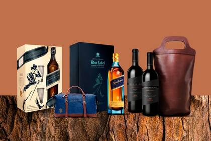 - Johnnie Walker Blue con 2 vasos + bolso Johnnie Walker de regalo.El ícono de la casa Walker, el Blue Label, mezcla de whiskies muy antiguos, con dos vasos donde disfrutarlo y un precioso bolso como obsequio.