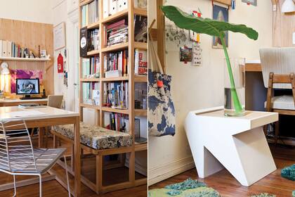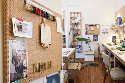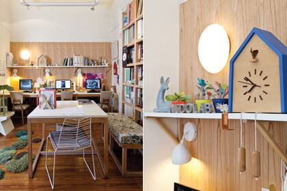 Se usó madera de paraíso en los paneles detrás de los escritorios trabajo, en la biblioteca y en la mesa de reunión con tapa de MDF laqueada. Completan la banqueta ‘Paka’ en madera laqueada y esterilla (todo de Nidolab), el perchero modular (Net Muebles) y las alfombras de Alexandra Kehayoglou. Las sillas vintage, un hallazgo en plena calle.