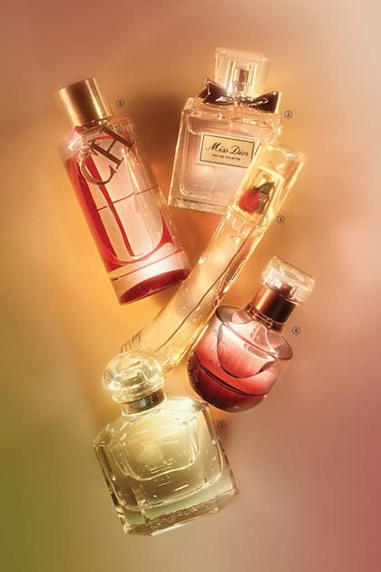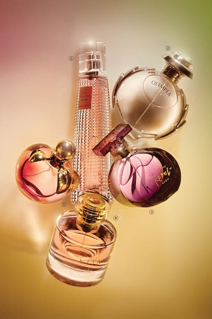 1.Live Irrésistible Rosy Crush (EDP de 75 ml, Givenchy), 2.Olympea (EDP de 80 ml, Paco Rabanne), 3.Far Away Rebel (EDP de 50ml, Avon), 4. Fragancia floral y frutal dulce (EDT de 100 ml, Vitamina), 5.Nina (EDT de 80 ml, Nina Ricci)