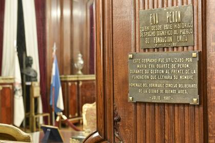 En el Salón Eva Perón se pueden apreciar el escritorio, las sillas y algunos objetos de trabajo que utilizó Eva como un hermoso y tradicional tintero. En una vitrina descansa una muestra del tapizado original de los sillones. Muy cerca de ese despacho funcionaba un espacio donde se les preparaban mamaderas a las madres que llegaban con sus bebés a pedir ayuda y asistencia social. Por eso, además, el salón está ubicado muy cerca de la puerta de acceso a la calle. "Hoy, este salón es la antesala al Recinto de Sesiones. Es un lugar muy importante y simbólico porque se encuentra ubicado en el medio del despacho del Presidente y el del Vicepresidente Primero. Ambos, para ingresar al Recinto, deben pasar por este salón. También tiene un uso protocolar, para la realización de eventos y para la negociación política", explica Bellocchio. Dado que durante este año se celebra el centenario del nacimiento de Eva Perón, el escritorio será restaurado para poder ser exhibido en impecable estado antes del 10 de diciembre. Aún se conserva mucho material epistolar en la biblioteca del edificio. Indudablemente, pisar ese alfombrado histórico es sentirse parte de la historia nacional. La boiserie, el bahiut, y los potiches de vidrio le confieren elegancia al lugar. "De acuerdo al sitio que se recorre se privilegia el valor arquitectónico o el histórico. En el Salón Dorado, la gente se maravilla con la arquitectura, pero en el salón Eva Perón lo que sobresale es la historia, la figura de Eva", reconoce Figueiras.