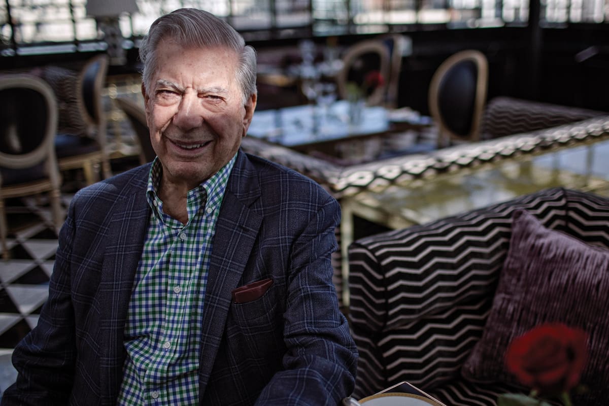 Ahora Vargas Llosa se aproxima a la entrevista guiado por el empresario argentino Gerardo Bongiovanni, su amigo y miembro del consejo de la Fundación Internacional para la Libertad (FIL) de ideas liberales, que el escritor preside. Viste una camisa a cuadros en verde, azul y blanco y un saco azul con líneas grises y lleva el jopo bien peinado. Con paciencia, se presta para la sesión de fotos que empieza allí y sigue en el piso diez, desde cuyas ventanas puede verse el Río de la Plata. Después se reclina en uno de los sillones del lobby contiguo, me exige que lo tutee y, botella de agua sin gas sobre la mesa, empieza a hablar sobre su arte y sobre su vida, como si todos los caminos condujeran (o los hiciera conducir) a la literatura.