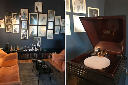 A la izquierda, un pequeño salón de música con una poltrona proust ubicada en el centro del espacio en tonos celestes. A su alrededor, una biblioteca en color verde agua con una colección de vinilos y un sistema de audio de alta fidelidad.