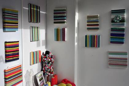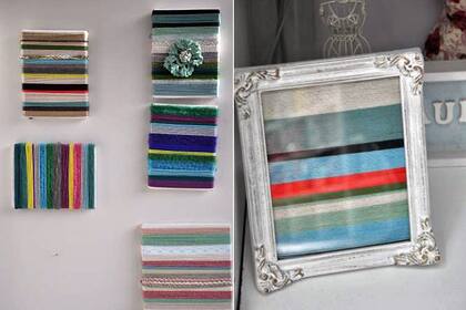 Son bastidores recubiertos en lana y lana enmarcada con un marco antiguo (una buena forma de recordar a la abuela tejedora sin usar una foto). Hasta yo, que soy un cero con las agujas, podría aprovechar esta idea y las combinaciones de colores que Celeste, dueña del local, eligió para elaborar sus cuadros, a modo de muestrario. Me da una sensación cálida, como si fuera una buena forma de abrigar la casa en invierno.