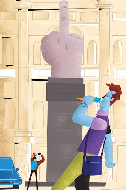 Un dedo es un dedo es un dedo: en la reescritura del aforismo, esta mano de cuatro metros de alto dice lo que muchos querríamos decir desde un pedestal. Lo miro desde abajo en todos los ángulos posibles y el increíble realismo de su rigidez fálica impresiona: es el símbolo universal del desprecio. El artista Maurizio Cattelan, uno de los más celebrados y discutidos de Italia, lo montó hace casi una década y sigue ahí, a pesar de los intentos por mudarlo a una plaza donde provoque menos incomodidad que en la Piazza Affari, tan pulcra y escenográfica (hace unos años vi en Nueva York otras instalaciones suyas igual de irritantes: un Juan Pablo II tamaño natural, caído sobre el piso y golpeado por un meteorito con expresión de dolor, tan pero tan real que un buen samaritano tenía el impulso de correr a ayudarlo).