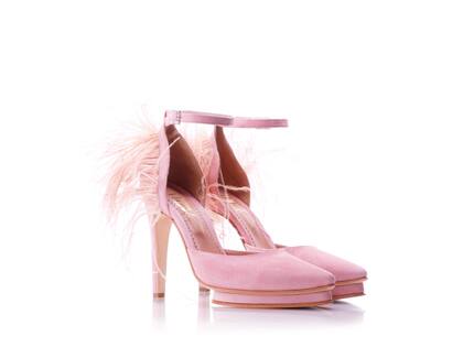 Para las que amen los tacones, Valdez nunca defrauda con su creatividad, como estos stilettos de gamuza con pulsera y talón con plumas. Espectaculares para una fiesta de verano (precio especial con descuento $3550).