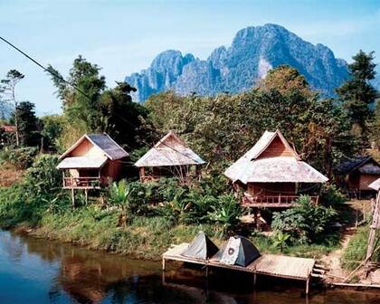 En Vang Vieng, Laos, la oferta de alojamientos es variada, y los hay para todos los presupuestos. Junto con las casas de invitados a la vera del río Nam Song, que tienen el confort de las clásicas cabañas de un turismo intermedio, se puede optar también por las tiendas de campaña más rústicas y primitivas, para quienes prefieran el sabor de lo agreste y natural