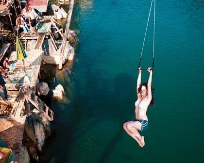 Una mochilera cuelga de un trapecio móvil en el tercer bar de la ruta de tubing del río Nam Song, en Laos. El