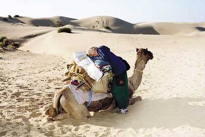 Ganada por el cansancio, una mochilera sueca espera a su grupo mientras descansa en un alto del safari en camello, una de las actividades más populares entre los jóvenes turistas extranjeros que visitan el desierto de Thar, en Rajastán, cerca de la frontera indo-paquistaní