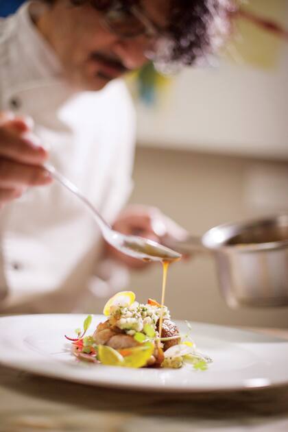 Ahora es él quien cuida la cocción de las mollejas. “La prueba” francesa de la perfección ya la pasó hace rato y con honores, pero le gusta decir que se siente un “obrero de la cocina”.