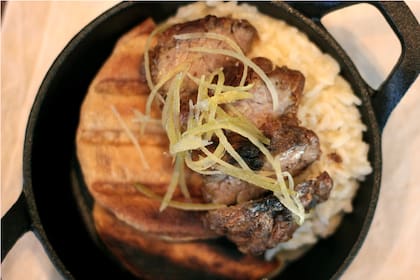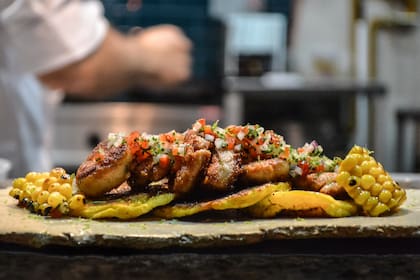 Forma parte de la sección "Platitos" de la carta que ofrece varias opciones para picar y compartir. Lleva una base de tortilla callejera o "santiagueña" –un pan finito–, por encima, un risotto milanés hecho con abundante manteca y queso parmesano y, para coronar, una porción de molleja asada a la parrilla con limón que sale bien crocante. El plato se termina con unos pickles de piel de limón que acentúan mucho más el sabor alimonado de la molleja, la protagonista.