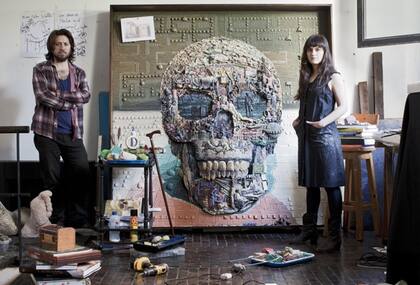 Sus obras –retratos, paisajes, escenas pornográficas bajadas de internet, escenas amorosas sacadas de su vida diaria– están hechas con la materia prima de la cotidianidad. El chino y la mercería son sus proveedores de materiales. Donde otros pintan con óleos, ellos usan galletitas, carne, espejos de colores, plumas y, en los últimos años, plastilina e hilos. Estos elementos son los que sostienen la muestra que acaban de exponer en el Museo de Arte Moderno de Buenos Aires ( MAMBA ), con gran éxito de público. Convocantes y muy bien pagos en las galerías de arte donde se mueve el dinero de verdad (en el momento de la entrevista, estaban terminando una calavera plagada de iconografía argenta, ícono de Clarín festejando la caída de un gobierno incluido, que se embarcó rumbo a los Emiratos Árabes), hace cinco años que no exponían en Buenos Aires. El éxito de la muestra los puso felices. Los Mondongo son de acá, hablan de cosas de acá y crean acá, en un estudio de dos pisos pequeños y atiborrados de cuadros y materiales.