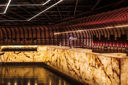 Frente a esta estructura fluida, se destaca una barra central de diseño monolítico y contundente, que funciona como núcleo funcional del servicio gastronómico. La convivencia entre estos dos elementos —dinamismo y solidez— da forma a una atmósfera única, donde cada visitante puede vivir una experiencia premium antes del espectáculo.