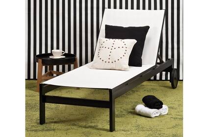 Reposera ‘Júpiter’ ($4.315) con almohadón negro (todo de Coin Vert) y almohadón ‘Paz’ con tachas de 40x40 ($130, Apatheia). A su lado, mesa ‘Quiti’ de incienso y MDF laqueado con bandeja desmontable (desde $1.100 , Las Marinas); taza y plato ‘Shabby’ ($110, Azora). Toallas para rostro ($26,40 c/u, Franco Valiente).