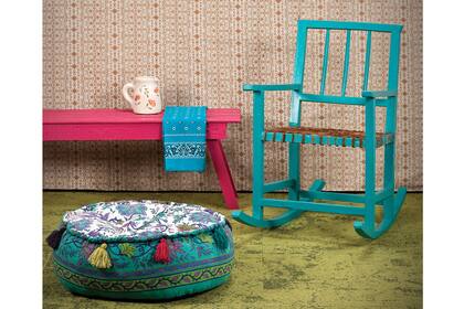 Sobre la alfombra modular de Interface (Kalpakian), mecedora antigua con asiento de tiento ($1.800, Husos y Costumbres); banco de madera ($149) renovado con pintura fucsia ($74,80, todo de Easy) con lonas ‘Bandana’ ($58,20 c/u, Franco Valente) y una jarra de cerámica pintada ($310, Azora). En primer plano, puf ($490, Butik); de fondo, lona reversible ($ 375, Prynt).