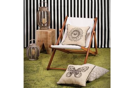 Sobre la alfombra Interface de módulos de 50x50 (Kalpakian), reposera ‘Iberá’ ($258, Easy) con almohadón de arpillera de 40x40 modelo ‘Girasol ($130, Apatheia). Banquito de álamo al natural ($605, Las Marinas) y fanales ($290 y $450, Coin Vert). En el piso, almohadones ‘José’ con arabescos marrones y ‘Mariposa’ de 40x40 ($130, Apatheia). De fondo, lona reversible ($375, Prynt).