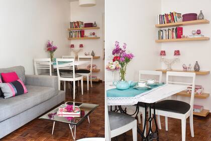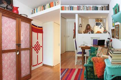 El nicho sobre la cocina sirve para guardar los libros de la dueña de este monoambiente. Una idea ingeniosa para cuando los metros no sobran.