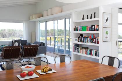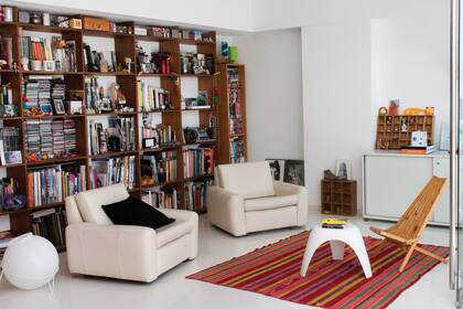 Una gran biblioteca de ocho metros, que recorre de punta a punta el living dejando ocultos un baño y un bajo escalera. No sólo contiene material de consulta, sino que, además, permití colocar algún que otro objeto o retrato.