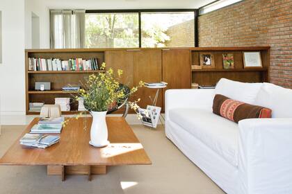 En este living, la biblioteca de madera con infinitos espacios de guardado atesora objetos y libros por doquier. Aquí, sin dudas ella es la protagonista del espacio.