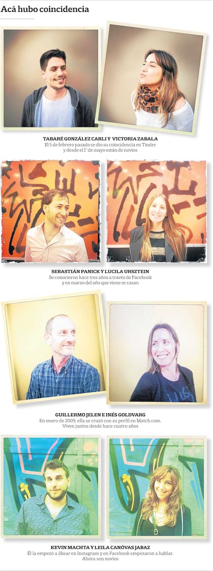 Así resultó entre Victoria y Tabaré. Se venía el cumpleaños de ella y él estaba invitado, pero la condición era conocerse antes. Hasta entonces, sólo habían estado hablando por Facebook y WhatsApp. Él pasaría a buscarla por la casa. "Me daba vergüenza, estaba renerviosa. Tenía en mente que saldría y lo conocería dentro del auto y de repente lo veo que se bajó y caminó hacia mí con una seguridad que me cautivó. Fue la cereza del postre." Ahora, cada vez que les preguntan cómo se conocieron, se miran y se ríen. También ellos se preguntan qué les contarán a sus hijos el día de mañana. Bueno, seguramente, empiecen por explicarles de qué se trataba eso de Tinder.