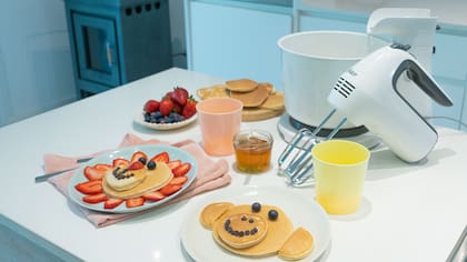 ¡Estos pancakes de caritas de animales son especiales para cuando los niños piden un desayuno diferente! Colocá todos los ingredientes de los pancakes en el bowl de la batidora de pie y mano Oster. Después comenzá a batir de velocidad baja a media hasta que la mezcla este unida y uniforme. ¡Tip: Aprovechá y sacá la batidora del pie para finalizar la mezcla a mano! Calentá una sartén a fuego de bajo a medio y engrasada ligeramente. Colocá de a cucharones la mezcla y cociná por 1 ó 2 minutos de cada lado o hasta que estén dorados y cocidos. Por último, armá las formitas deseadas cortando los pancakes y terminando con las frutas. ¡Animate y hacelos, es muy fácil y les van a encantar!
