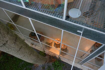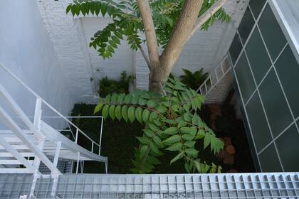 La casa tiene 110 metros cuadrados. Conservé una parte de la original, ahora cocina y oficina, conectada a este doble espacio del nuevo proyecto. Investigué mucho para poder realizarlo de esta forma, hasta le encargué los cálculos a una arquitecta especializada. Quería que todo fuera metálico, por eso también investigué las mallas de acero galvanizado hechas a medida para el entrepiso, la rampa y el entrepiso de arriba- que es una glorieta moderna a la que se accede desde una escalerita ubicada justo bajo el árbol. Tiene un tratamiento para que no sea resbaladizo y la casa se pintó de blanco para potenciar el metal. No quería nada de color. El piso es de cemento alisado. Adelante, en lo que era la vieja sala, generé un patio en torno a un árbol que creció espontáneo durante los años que estuvo abandonado el terreno. Podría haber ganado más superficie, pero preferí rescatar la luz, el verde y esa glorieta arriba que se funde con el árbol en verano".