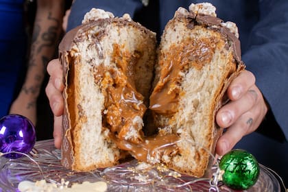Pan dulce relleno. La receta tradicional de pan dulce con relleno 100% de dulce de leche, garrapiñadas y baño de chocolate