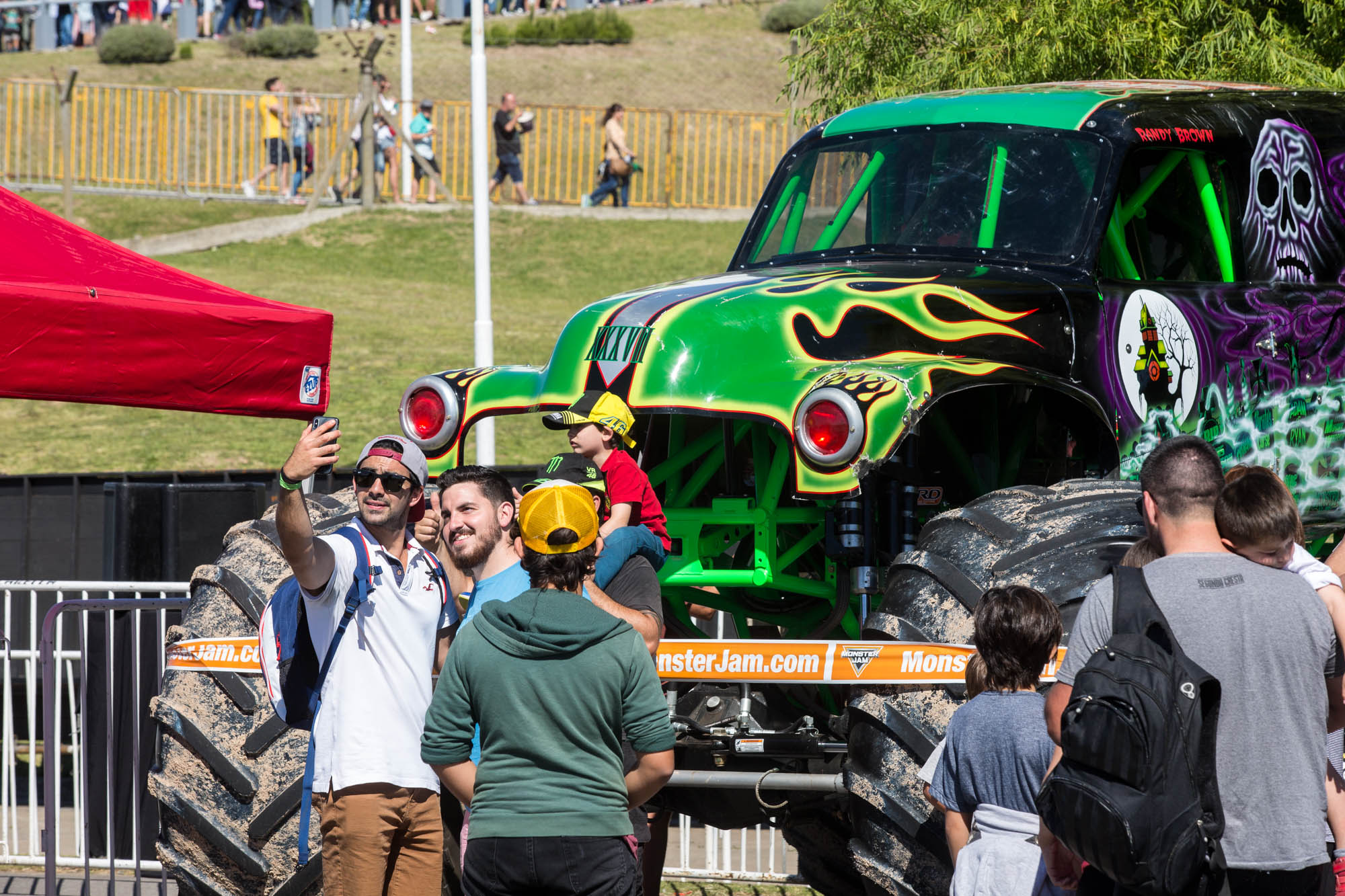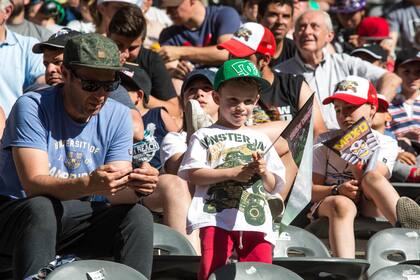 Acaban de presenciar el "two wheel challenge" y la excitación los desborda: se paran sobre la falda de sus madres, las interrumpen cuando hablan. Están rodeados de 30.000 personas, desde bebés de pocos meses en huevitos hasta abuelos que trajeron a sus nietos. Sin distinción de edad, el público luce gorras y remeras de Monster Jam, la exhibición de piruetas de los camiones más potentes del mundo, o de algunas de sus estrellas: Grave Digger, Zombie, Megalodon, Pirate’s Curse, Max-D. Comen pochoclo de un balde gigante ($200 con un vaso de souvenir). O hot dogs. O papas fritas con ketchup. Toman Coca común. Los adultos –bermudas, musculosas, gorras de NY– solo se diferencian por la lata negra de Monster Energy en sus manos. La bebida energizante auspicia a uno de los ocho monster trucks.
