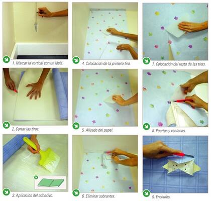Tomar los rollos de papel, medir la superficie a cubrir (siempre teniendo en cuenta 5 cm de excedente) y cortar el rollo en tiras. Prestar atención a la trama de las diferentes tiras. Para asegurarnos que coincidan los gráficos podemos numerarlas y marcar en qué orientación deben ir (techo o piso).