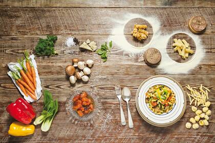 "Cocino cada verdura por separado y, unifico los sabores con un hilo de aceite de oliva, sal y pimienta. Cuando la pasta está lista, la mezclo con las verduras y emulsiono con un poquito de agua de cocción. Usé ajíes, hongos, zanahorias, pak choi y cherry confitados. Al final, una aromática de hojas blandas y queso".