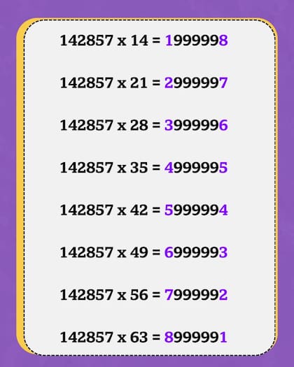 Otra curiosidad es que si insertás un 9 en el centro del número, de manera que quede 142 9 857, al multiplicarlo por cualquier número del 1 al 6, el producto conserva la naturaleza cíclica, manteniendo siempre un 9 en el centro.