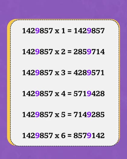 Eso ocurre con todos: al multiplicarlo por 6, el resultado empieza con 8 y continúa con lo que se encuentra al girar: 5, 7, 1, 4 y 2. Pero, ¿qué pasa si cruzás el umbral y lo multiplicas 142857 por 7?