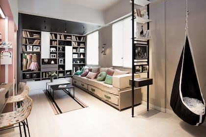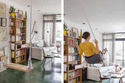 Integrar elementos infantiles en el mundo adulto fue el objetivo de María Dolores Guaita, del estudio 510 cuando proyectaron este departamento en el que un padre separado recibe a su hija. Las hamacas, colgadas en la entrada del living cumplen exitosamente la misión.