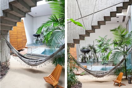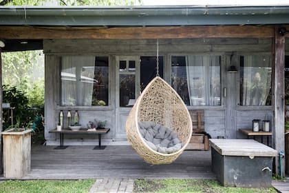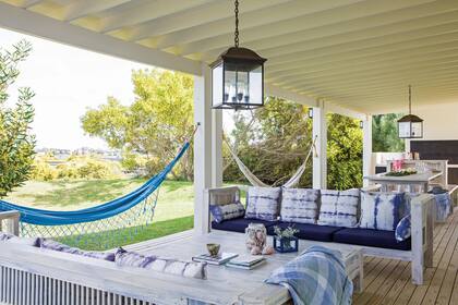 Donde haya dos postes, se puede colgar una hamaca. Siguiendo esa máxima del confort en tiempo de ocio, los dueños de esta casa completaron su generosa galería con dos hamacas en azul y blanco, los colores que predomina en este refrescante espacio. De solo verlas, en la mente se dispara un pensamiento: vacaciones.