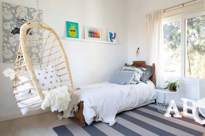 En su versión de lona, esta hamaca ‘Capullo’ le pone mucha onda a la habitación de un adolescente creada por Dash y combina con el resto de la ambientación con muebles flexibles y colores atractivos.