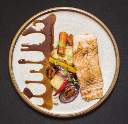 - El plato: salmón a baja temperatura con verduras a la plancha ($470).