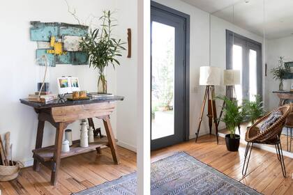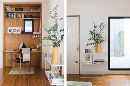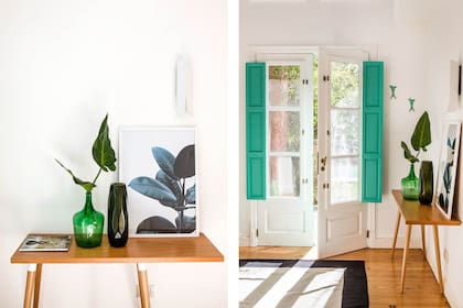 Una mesa liviana con estantes de vidrio (Bronx Décor) funciona como primer espacio de apoyo al entrar a esta cálida casa refaccionada por la arquitecta Paula Varone. Para aprovechar al máximo el espacio de la recepción, del otro lado, donde antes estaba la puerta de ingreso se generó un escritorio con fondo y estantes de petiribí (Ramón Argüello) que tiene una pequeña ventana. Lámpara (Kikely). Alfombra verde seco tejida a mano en lana de oveja (Elementos Argentinos). Manta (Arredo).