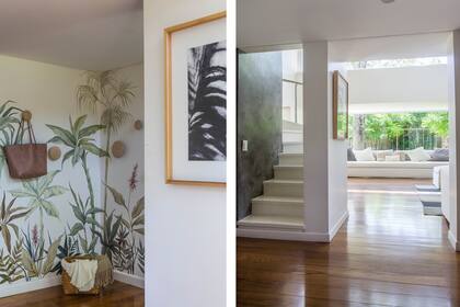 "Este mural fue un regalo de cumpleaños: me saca una sonrisa cada mañana cuando bajo a desayunar, me recibe bien cuando entro y me tira buena onda al salir". ¿Qué más se puede pedir de un rincón del hogar? Esta colorida esquina realizada por Florencia Chedufau vincula el living con la planta alta a través de una escalera abierta, con barandas de acero. Subir por los escalones de madera pintada se convierte en oportunidad cotidiana de disfrutar del jardín desde distintas alturas. Cuando la casa se llena de invitados, los percheros redondos (Brocca) pueblan el paisaje tropical.