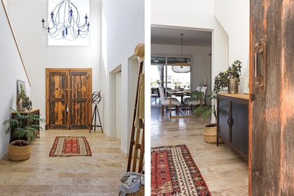 A través de una gran puerta de lapacho se ingresa a un pasillo distribuidor con doble altura, coronado por una araña de hierro comprada en el Puerto de frutos. A un lado, la puerta de ingreso al primer showroom de Lacroze Studio, a cargo de Natali y Geraldine Picayo, de Lacroze Studioy, al otro, la escalera con pasamanos de guatambú que conduce a la segunda planta. Varias ideas se conjugaron felizmente: la de lograr una luz sin filtros para iluminar cada rincón, generar un contraste entre elementos rústicos como la madera y el Travertino con las paredes claras y generar expectativa con una robusta puerta ciega. La decoración se resolvió con un vajillero de corte industrial (Lacroze Studio), canastos (Fraternidad) y kilim (Rugit).