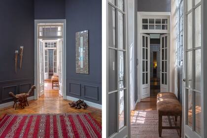 Gris oscuro es el tono ideal para el recibidor de este departamento de 1920 reciclado por los arquitectos Javier Figueroa y Horacio Méndez, expertos en comprar casas, recuperarlas, decorarlas con sus propios muebles y luego venderlas. Haciendo gala de su particular estilo organizaron la recepción con un par de candelabros de plata con cabo de pez espada, una escultura en palo santo realizada en una comunidad wichi, una suerte instalación de hormas de madera y una alfombra marroquí. Buen gusto y personalidad