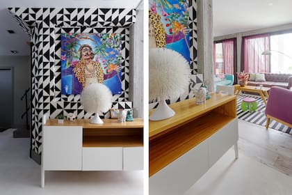 La estética psicodélica de la entrada deja claro que todo lo que sigue en esta casa será sorprendente. Sobre la pared, empapelado 'Tofio Negro' (Picnic) que sirve como marco para el cuadro con la imagen de Dalí (Sergio Santancieri). Para regular la intensidad, sumar superficie de apoyo y espacio de guardado, optaron por la consola laqueada de paraíso natural 'Apolo 2' (Vaserdelona).