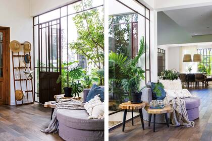 En la casa anterior de la diseñadora de interiores Sol Palou el hall de entrada también funciona como hall de de distribución: hacia un lado, se integra naturalmente con el comedor; hacia el otro, se comunica con el pasillo que da a los cuartos de los chicos y los playrooms. El perchero de pie está justo donde tiene que estar: cerca de la puerta y el sillón, curvo además de marcar la trayectoria de entrada, es perfecto para ver el jardín interno.