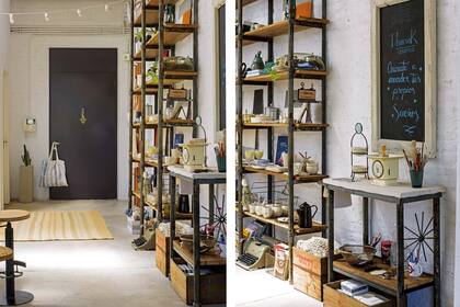 Desde la entrada queda claro que este es el estudio de una ceramista y que, lo que más necesita además de paciencia e inspiración, es espacio para sus piezas. Por eso, Karina Contini aprovechó el pasillo de entrada para ubicar estanterías tan colmadas que el picaporte funciona como perchero. El espacio está enmarcado por la alfombra de lana tejida y teñida a mano (Awanay).