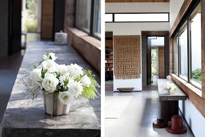 El diálogo constante entre arquitectura e interiorismo se ve materializado en la trama orgánica de esta casa donde conviven materiales nobles (hormigón a la vista, madera y cemento alisado, principalmente). Cada espacio está concienzudamente diagramado por Karina Kreth en función de los movimientos y necesidades de los dueños de casa. En el recibidor, consola con tapa de madera sostenida por persianas enrolladas a modo de patas (Pablo Ledesma). Sobre la pared, tapiz realizado por una comunidad nativa (Guayruro). Como gesto de carácter, los contramarcos se forraron con listones de madera de kiri arenada, para darle un aspecto poroso y rústico.