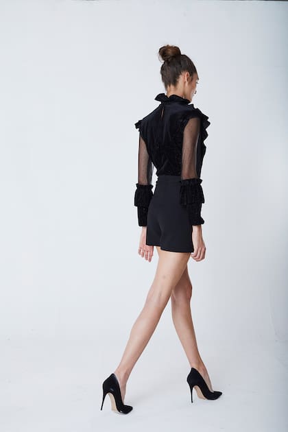 El mono You de Natalia Antolin, el top de gasa con volados laterales de Benito. En clave boho, recuperando el cuello choker que usaban los vestidos hippies, en un modelo de crepe liviano de Vitamina, con estampa floral de fondo oscuro, mangas acampanadas, cintura entallada y escote en V con corbatita.