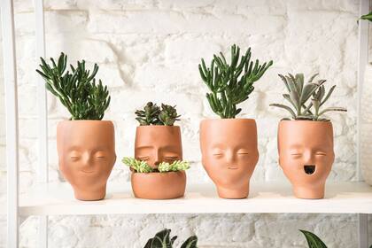 - Macetas de arcilla colorada, con formas de caras y distintos gestos, de 17 cm de alto y 13 cm de diámetro. Las macetas de terracota conservan mejor la humedad y logran una buena aireación por la porosidad del material, que permite filtrar aire. Desde $ 1800 c/u sin la planta, Pötit, www. potit.com.ar, IG: @potitplantas